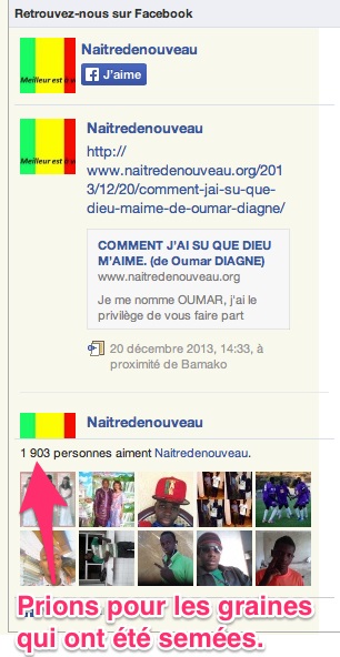 Près de 3000 jeunes maliens ont visité notre site et 1903 ont cliqué sur « J’aime ». Prions pour la graine qui a été semée grâce à votre participation à notre « campagne sur Facebook », soit par vos dons financiers soit par vos prières. Plusieurs ont réagit et sont en contact avec moi à travers la messagerie et sur Facebook.